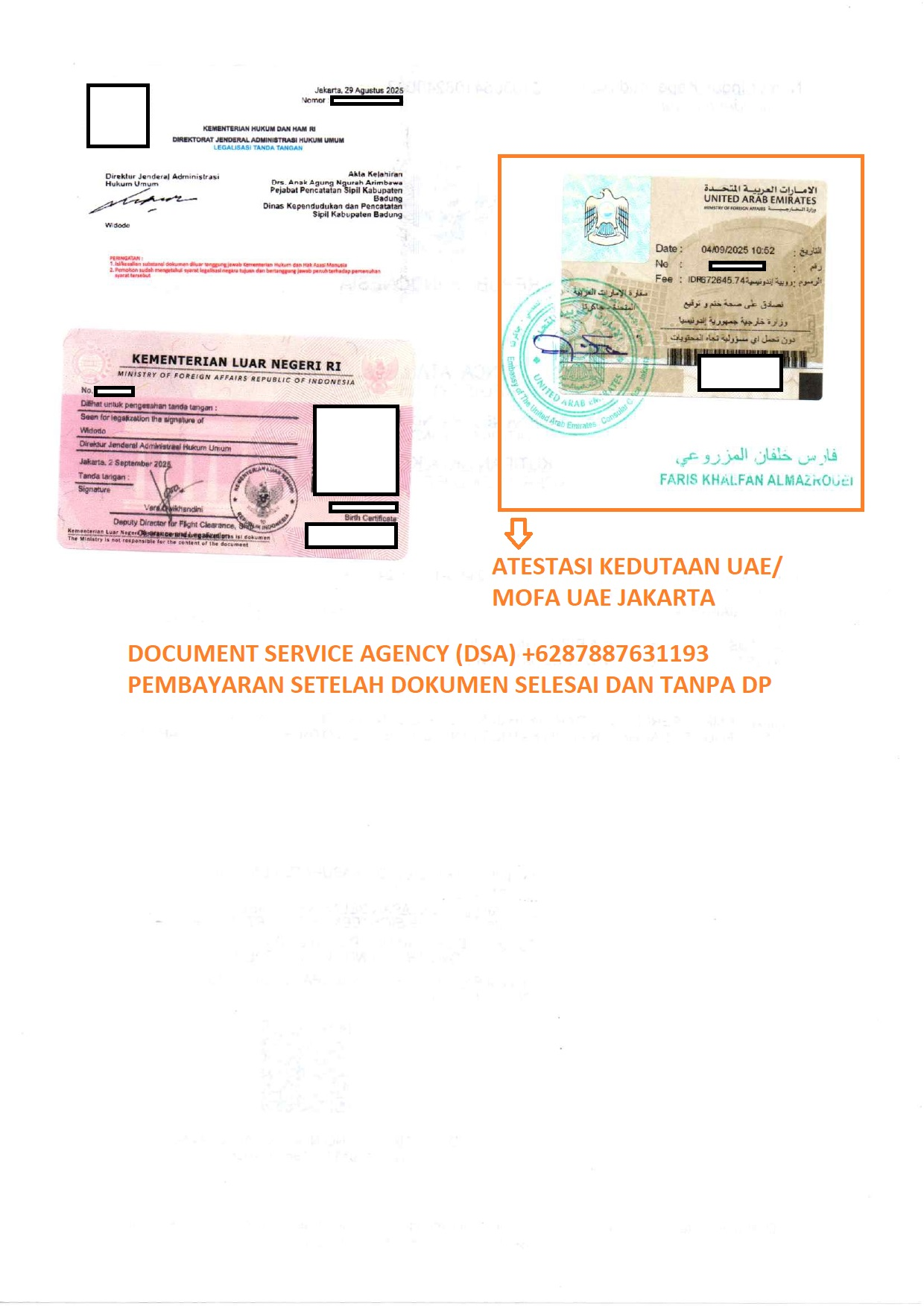 DSA (Document Service Agency) adalah spesialis jasa terjemah, legalisir, atestasi, apostile dokumen untuk keperluan di luar negeri dan pengurusan visa berpengalaman dan terpercaya. Bagi anda yang ingin melegalisir akta kelahiran di Kedutaan Uni Emirates Arab untuk keperluan pengurusan visa, izin tinggal, dan lain-lain. Percayakan legalisir dokumen anda kepada kami, dengan layanan ” Pembayaran Setelah Dokumen Selesai dan Tanpa DP ” anda akan merasa lebih nyaman dan aman menggunakan jasa kami. Dan dalam hitungan beberapa hari dokumen anda selesai dan siap untuk digunakan.