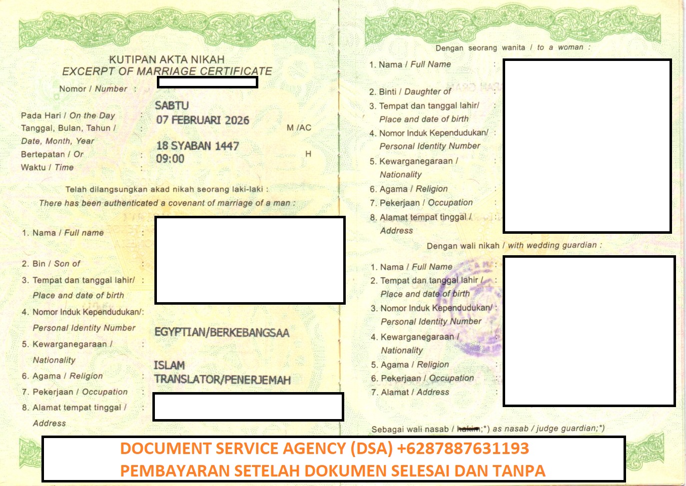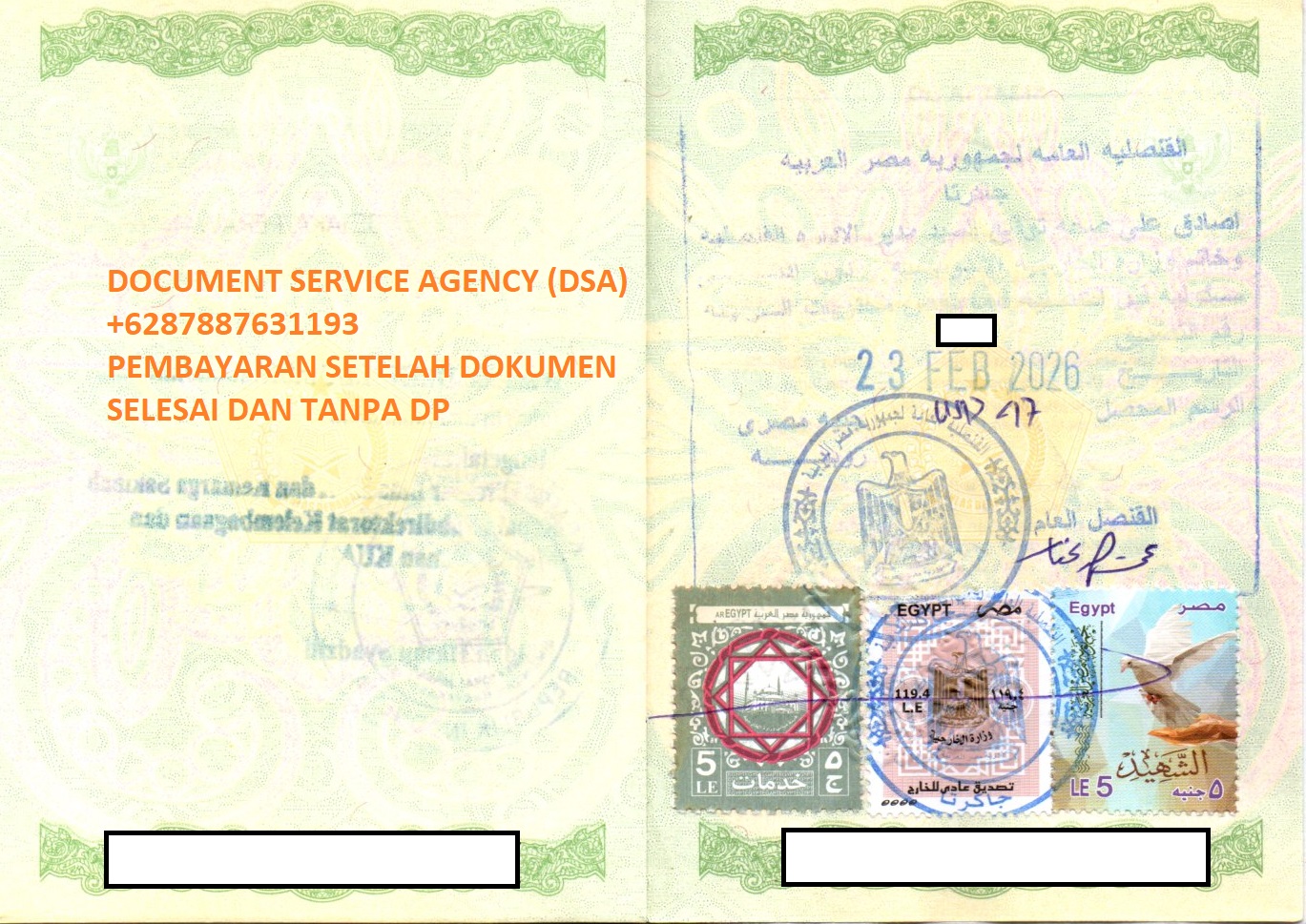 DSA (Document Service Agency) adalah spesialis jasa terjemah, legalisir, atestasi, apostile dokumen untuk keperluan di luar negeri dan pengurusan visa berpengalaman dan terpercaya. Bagi anda yang ingin melegalisir buku nikah di Kedutaan Mesir untuk keperluan pengurusan visa, izin tinggal, pendaftaran pernikahan dan lain-lain. Anda tidak perlu datang ke Jakarta karna pengurusan dokumen anda bisa diwakilakan kepada kami, dengan layanan ” Pembayaran Setelah Dokumen Selesai dan Tanpa DP ” membuat anda lebih nyaman dan aman menggunakan jasa kami.